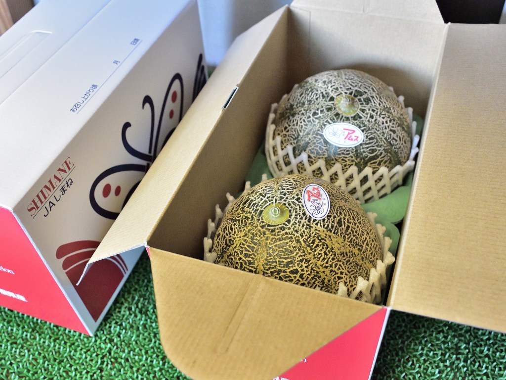 今週から島根県産美味しいメロンを販売しています。二個入箱と4個入があります。このメロンはハウス栽培のものです。よろしくお願いします。